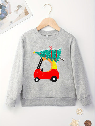 Christmas Tree & Car Print Sweatshirt for Boys - Comfortable Stretch Fabric Autumn/Winter Wear