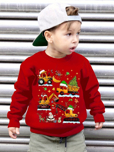 Christmas Excavator Tree Print Sweatshirt For Boys - Casual Creative Design With Stretch Fabric For Comfortable Autumn/Winter Wear